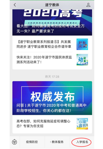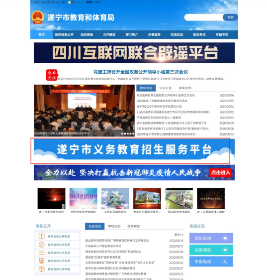登录遂宁市教育和体育局官网,网址: http://sjyj.suining.gov.cn,选择"遂宁市义务教育招生服务平台"窗口。