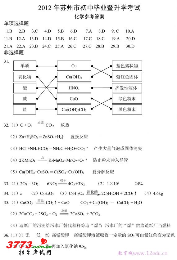 [组图]2012年苏州中考化学试卷答案及评分标准