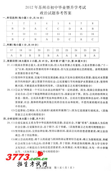 [组图]2012年苏州中考政治试题答案及评分标准