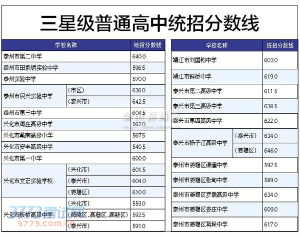 与去年相比,今年各市(区)大多数三星高中统招分数线有所下降。据了解,市区5所三星级普通高中统招分数线分别为:泰州市第二中学640分,泰州市田家炳实验中学596.5分,泰州市实验中学570分,泰州市第三高级中学604.5分,泰州市民兴实验中学面向市区为636分、面向泰兴市为642.5分。
