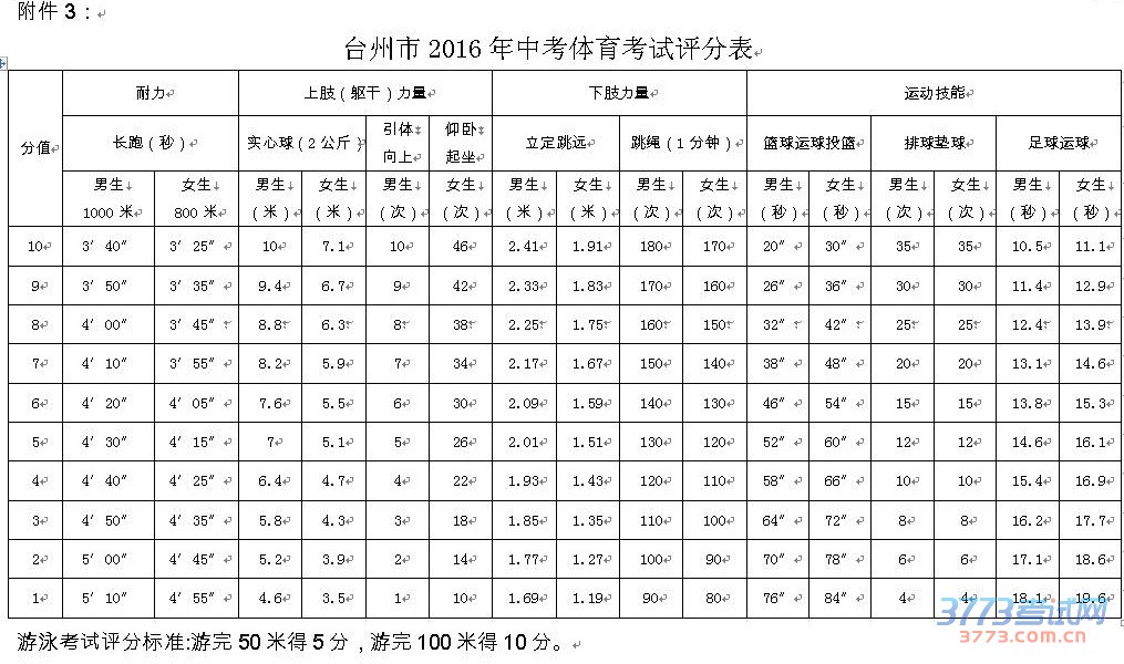 [图文]2016台州中考体育考试评分标准