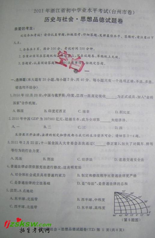 [组图]浙江台州市2011年中考历史与社会·思想品德试题