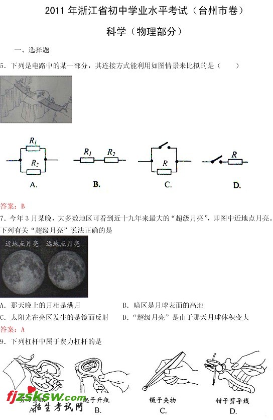 浙江台州2011中考物理试题及答案