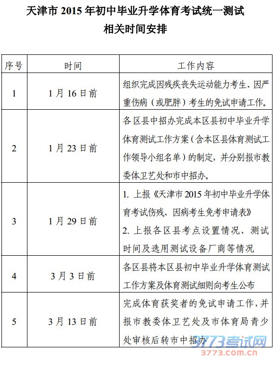 天津市 2015 年初中毕业升学体育考试统一测试 相关时间安排