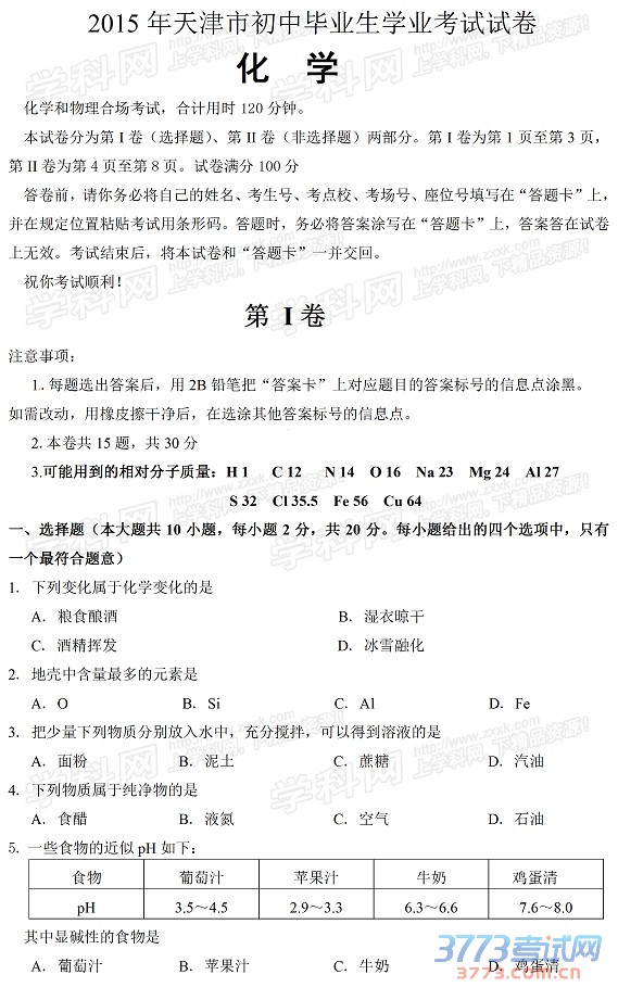 及时公布天津中考试题、答案和中考作文。祝各位考生都能取得好的成绩。2015年天津中考化学试题(图片版):