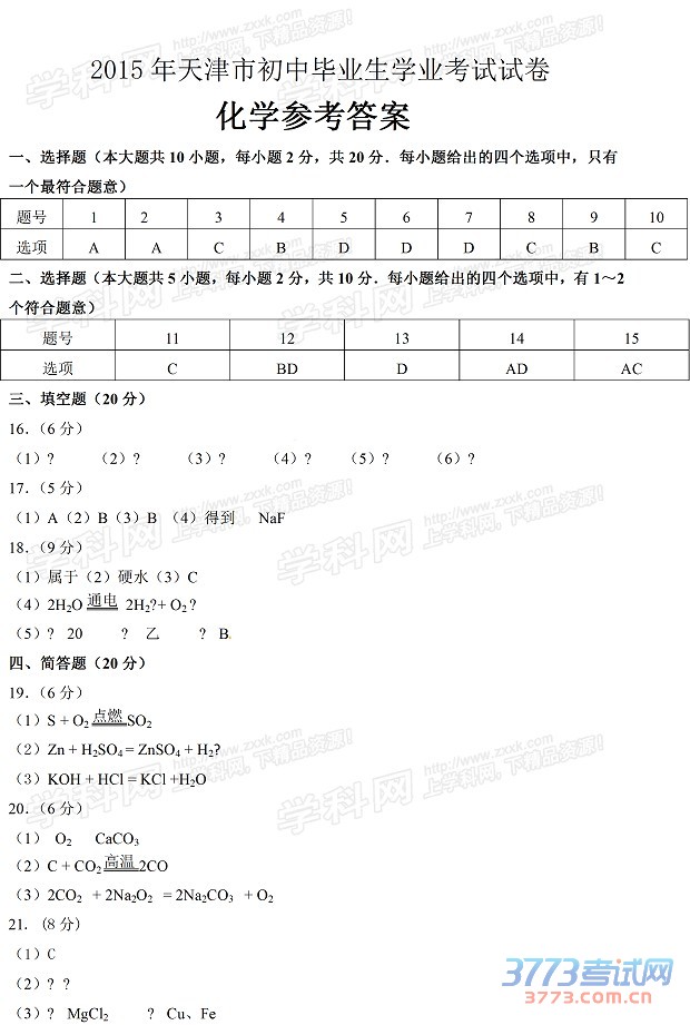 [组图]2015年天津中考化学试题及答案发布