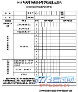 《2015年天津市高级中等学校招生志愿表》分为“市内六区考生使用志愿表”和“市内六区以外区县考生使用志愿表”两种。市内六区考生和市内六区以外区县考生分别选择相应的志愿表进行填写。