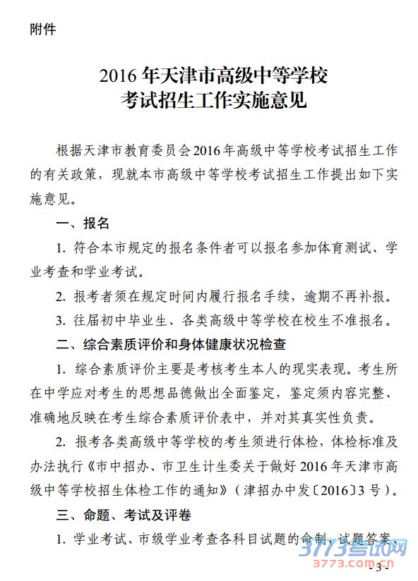 附件:2016年天津市高级中等学校考试招生工作实施意见
