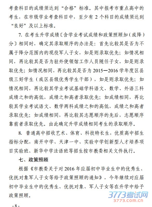 2016年天津市高级中等学校 考试招生工作实施意见 根据天津市教育委员会2016年高级中等学校考试招生工作的有关政策,现就本市高级中等学校考试招生工作提出如下实施意见。