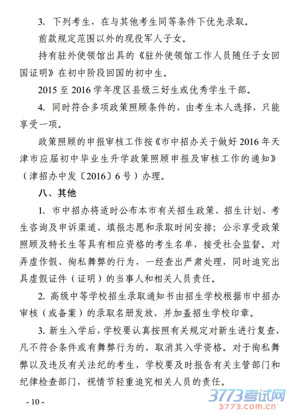 津市应届初中毕业生升学政策照顾申报及审核工作的通知》