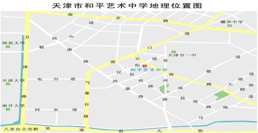 和平艺术中学地处和平区繁华地段,闹中取静,交通便利,可乘各路公交车到南京路国际商场站到达我校,也可乘坐800、858、870路到天津一中站下车,走路3分钟,14、35、 901、908、847路何兴村下车,走路5分钟 ,14路、908路沙市道有站,下车回走