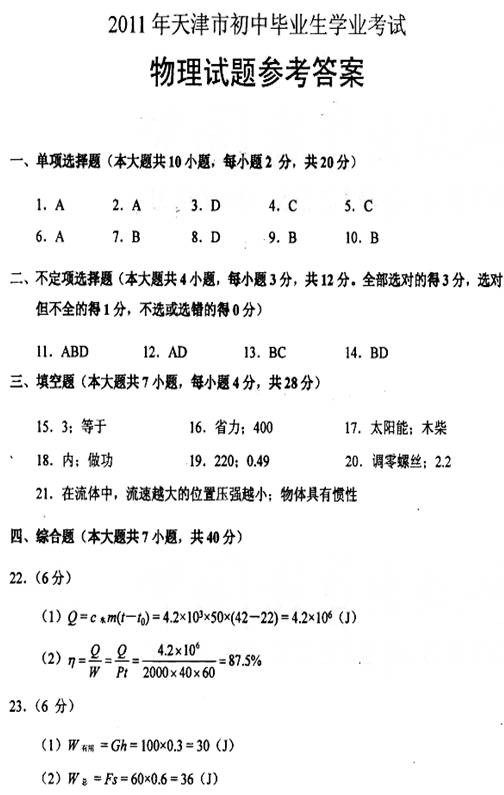 [组图]天津2011中考物理试题试卷及参考答案