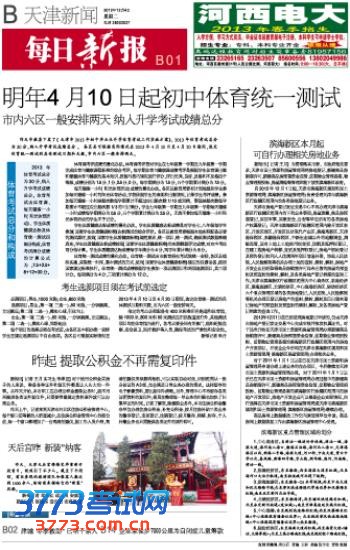 昨天市教委下发了《 天津市2013年初中毕业生升学体育考试工作实施方案》, 2013年体育考试总分为30分,纳入升学考试成绩总分 。 各区县可根据实际情况在2013年4月10日至4月20日期间,选定体育统一测试的具体测试日期和天数,市内六区一般安排两天。 体育考试总分和构成 2013年体育考试总分为30分,纳入升学考试成绩总分。体育考试由体育课、每天锻炼一小时(阳光体育活动)、学生体质健康达标及体育统一测试四部分构成,体育考试满分成绩的计算公式为:7.5+2.5+8+12=30分。 体育课考评成绩的量化办法。体育课考评是对学生在七年级第一学期至九年级第一学期完成体育与健康课程标准的综合考评。每学期体育与健康课成绩考评是根据学生体育课出勤和掌握体育与健康的基本知识、技能与技巧情况进行评分,评出优秀、良好、及格和不及格四个等级,成绩分别为1.5分、1分、0.5分、0分。每学期满分为1.5分,五个学期累计满分为7.5分。 每天锻炼一小时(阳光体育活动)成绩的量化办法。各区县教育局要有计划地组织学生参加每天锻炼一小时的阳光体育活动,学校依据学生的表现和出勤情况,记录学生考评成绩。参加每天锻炼一小时缺勤次数每学期累计不超过应出勤次数1/10或因病、事假缺勤次数每学期累计不超过应出勤次数1/3的可记满分。学生七年级第一学期至九年级第一学期每天锻炼一小时成绩每学期满分为0.5分,五个学期累计满分为2.5分。无故不参加每天锻炼一小时阳光体育活动的学生不予记分。 学生体质健康达标成绩的量化办法。学生体质健康达标成绩是对学生七、八年级每学年参加《国家学生体质健康标准》达标测试的综合评价。各区县教育局要根据本地实际配备必要的测试器材,按照《国家学生体质健康标准》规范要求,统一项目,统一测试,确保测试数据准确真实。学生体质健康达标成绩按照《国家学生体质健康标准》的实测数据评定成绩,对应中考体育分值计算。学生体质健康达标成绩每学年满分为4分,两学年累计满分为8分。 体育统一测试成绩的量化办法。体育统一测试由市教育招生考试院统一安排,各区县组织实施,采取统一时间、集中测试的方式,使用《国家学生体质健康标准》规定的仪器设备,按照国家规定标准执行。体育统一测试成绩根据学生参加一项必测项目和两项选测项目,共三项计分。每项满分为4分,三项累计满分为12分。 考生选测项目须在考试前选定 必测项目:男生:1000米跑;女生:800米跑 选测项目:男生:第一项(三选一):50米跑、一分钟跳绳、立定跳远;第二项(二选一):掷实心球、引体向上 女生:第一项(三选一):50米跑、一分钟跳绳、立定跳远;第二项(二选一):掷实心球、仰卧起坐 每个项目的选择必须在考试前,由各区县中招办统一安排学生在规定选测项目中自由选项。各区县可根据实际情况在2013年4月10日至4月20日期间,选定体育统一测试的具体测试日期和天数,市内六区一般安排两天。 指定的考点必须配备有400米标准田径跑道和体育馆,除1000米、800米和50米测试在田径跑道进行外,其他测试项目均在体育馆内进行。各考点要会同有关部门,组织纪检监察、安全保卫、医疗救护等人员,确保考试的严肃性和安全性。新报记者 朱丹 |