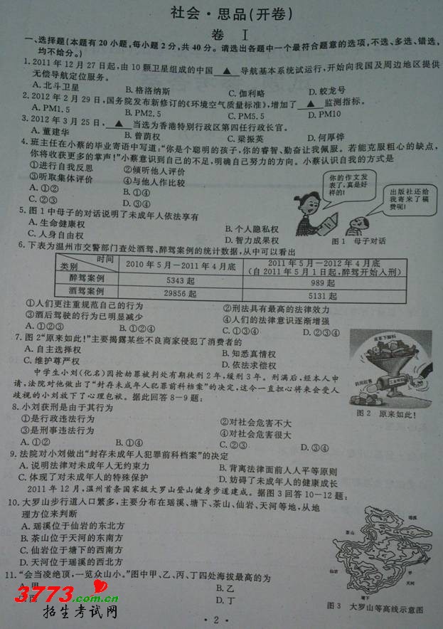 浙江2012年温州中考社会思品试题附答案(扫描版)