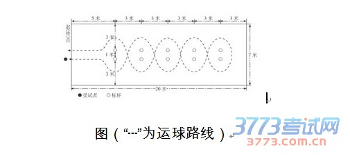 考生在起点线后持球站立,听到出发口令后,按图中所示箭头方向单手运球依次过杆,监考员发令后开表计时,考生与球均返回起终点线时停表。以秒为单位记录成绩,精确到小数点后1位,小数点后第2位数按非零进1原则进位。运球中如球脱手应自行捡回,并在脱手处继续运球,计时不停止。若出现抢跑、双手同时运球、膝盖以下身体部位触球、漏绕标志杆、碰倒标志杆、人或球出考试场地、未按要求路线完成考试的行为,考试成绩无效。每人可考二次,择优记取其中一次成绩。二次考试成绩无效,按7分记取。