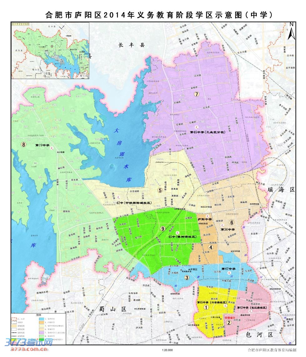附件2:庐阳区2014年各中学学区界定1.合肥市第19中学:(1)四里河路以西,临泉路以北,砀山路以南,西南面与蜀山区相接。(2)四里河路以西,砀山路以北,大杨镇区域。(3)三十岗乡区域。2.合肥市第36中学:蒙城北路以东,义井路和合瓦路和濉溪路以北,合九铁路线以南,东与瑶海区相接的区域。3.合肥市第42中学长江路校区:(1)宿州路以西,阜南路以南,长江中路以北,花园街和阜阳路以东。(2)宿州路以东,长江中路以北,沿河路以南,环城东路以西。(3)桐城路以东,环城南路以北,环城东路以西,长江中路以南。4.合肥市第42中学中铁国际城校区:(1)淮北路以西,防汛路以南,四里河路以东,砀山路以北。(2)蒙城北路以西,淮北路以东,砀山路以北,电厂路以南。5.合肥市第45中学六安路校区:(1)环城西路以东,长江中路以北,花园街、阜阳路以西,阜南路以南。(2)环城西路以东,环城南路以北,桐城路以西,长江中路以南。6.合肥市第45中学橡树湾校区:(1)砀山路以南,颍上路以西,临泉路以北,四里河路以东。(2)濉溪路以北,界首路以西,四里河路以东,临泉路以南。7.合肥市第45中学工业区分校:(1)合九铁路线以北,蒙城北路以东,东与新站区相接,北与长丰县相接的区域。(2)蒙城北路以西,电厂路以北,西到水库,北与长丰县相接的区域。8.合肥市第47中学:(1)蒙城北路以东,濉溪路以北,合瓦路以西,义井路以南。(2)板桥河以西,沿河路以北,濉溪路以南。(3)阜南路以北,宿州路以西,沿河路以南,环城西路以东。(4)沿河路以北,四里河路以西,西北与蜀山区相接。9.合肥市庐阳中学:(1)颖上路以东,临泉路以北,蒙城北路以西,砀山路以南。(2)界首路以东,临泉路以南,濉溪路以北,蒙城北路以西。(3)新华文景苑。