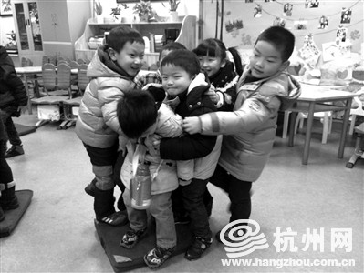 怎么办?老师们让小朋友自己想三分钟。最后,在老师的提示下,最矮的小朋友站在中间,其他一个一个站上去,基本上都挑战成功,大家一片欢呼。