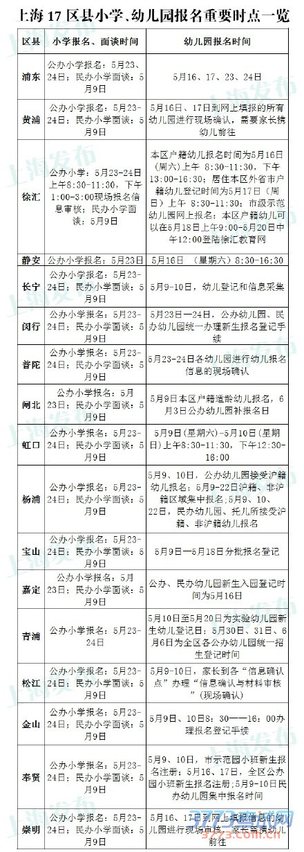 图说:上海17区县小学、幼儿园报名重要时点一览。上海发布