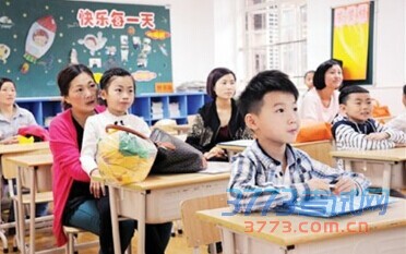 图片说明:昨天,在黄浦区外滩街道的一所小学报名点,报名入学的孩子和家长在教室里等候登记面试。