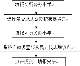 3.申请人填报程序:(1)在区教育局公布的有学位的公办小学中根据自己的排名和各校学位情况填报7所公办学校,填报学校分先后顺序。(2)自愿选择是否进行公办校志愿调剂。(3)在公布的民办小学中根据自己的排名和各校学位情况填报4所民办学校,填报学校分先后顺序。(4)系统自动选择服从民办校调剂,无需家长点击。具体程序如图所示: