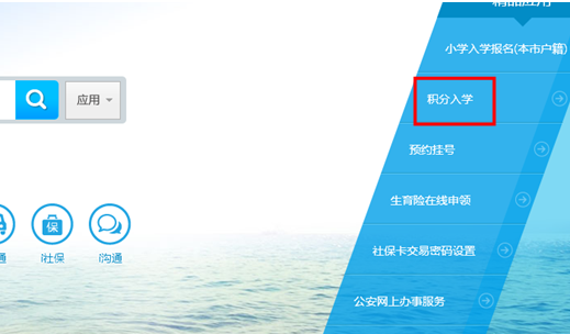 1.已在现场签字确认符合参加积分入学条件的申请人登录“i厦门惠民平台”后,点击网站右侧“积分入学”栏目,如下图所示: