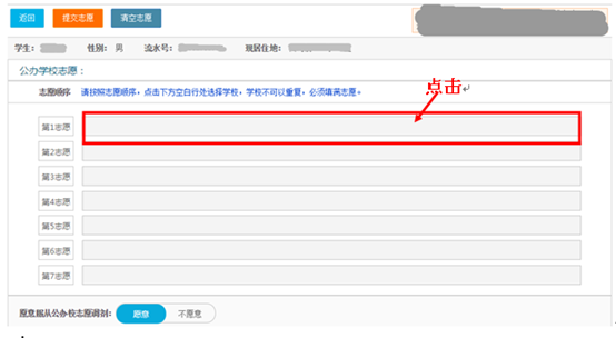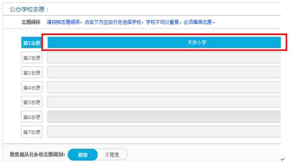 (1)关于公办校调剂的说明:填报完公办志愿后,申请人需选择是否服从公办校调剂。