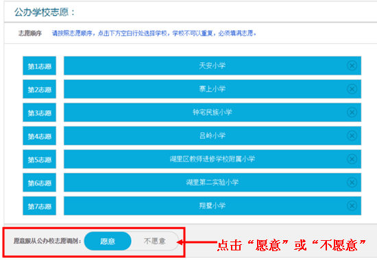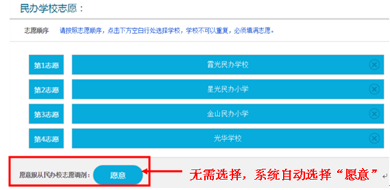 (2)关于民办校调剂的说明:所有人的民办校调剂都是系统自动选择“愿意”,确保参加电脑派位的申请人均能派到公办或民办学位。