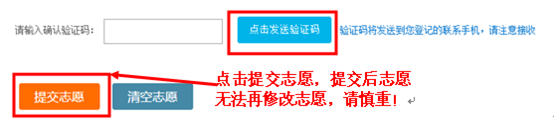 8.填报完所有11个志愿后,“点击发送验证码”按钮,获取验证码,输入正确的验证码后,点击“提交志愿”按钮。“提交志愿”按钮点击后,将无法对志愿进行修改,请慎重!