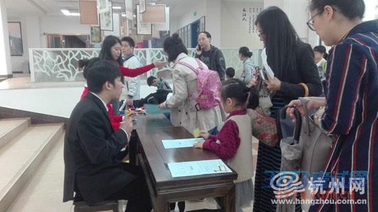 虽然今天天气不好,但下城区长江实验小学的校门口已经被家长和孩子围得严严实实。有的家长正在排队报名,有的则在门口翘首以盼,时不时探头看看墙的那一头,紧张、焦虑写了一脸。