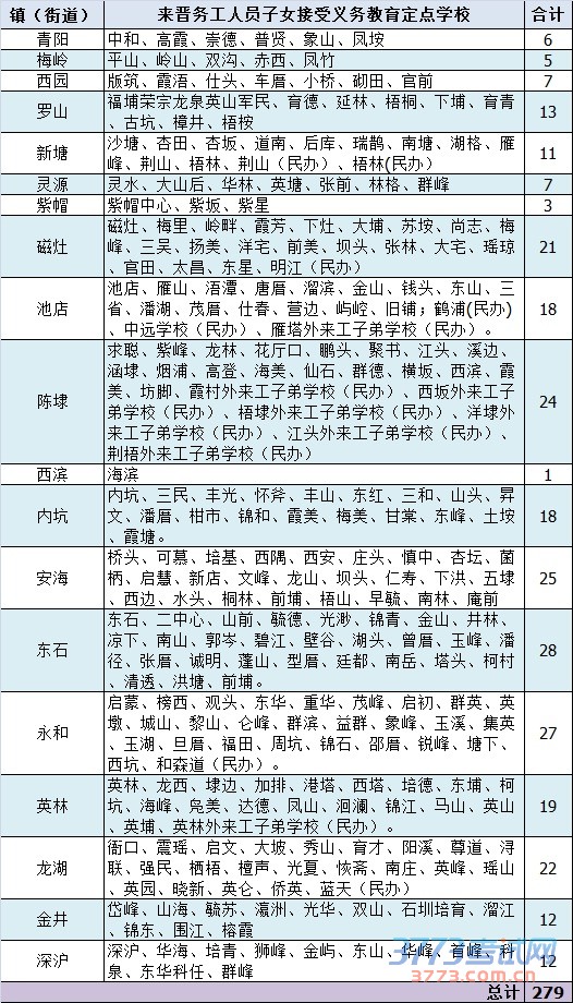 2016年秋季,晋江市除市直几所实验小学,梅岭的希信中心小学、心养小学,安海中心小学、养正中心小学、成功中心小学、金井毓英中心小学外,全市其他小学(279所)全部作为定点学校,接受来晋务工人员子女入学申请。定点学校占全市小学的95.2%。具体各镇(街道)“来晋务工人员子女接受义务教育定点学校”分布情况如下: