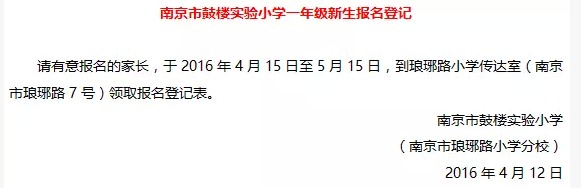 [组图]2016南京鼓楼实验小学小学一年级新生报名登记公告
