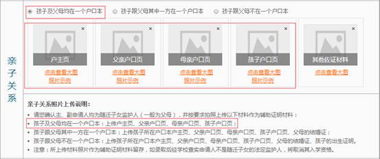 第二种情况:孩子跟父母其中一方在一个户口本,需要上传孩子所在户口本户主页、父亲户口页、母亲户口页、孩子户口页、父母的结婚证传。