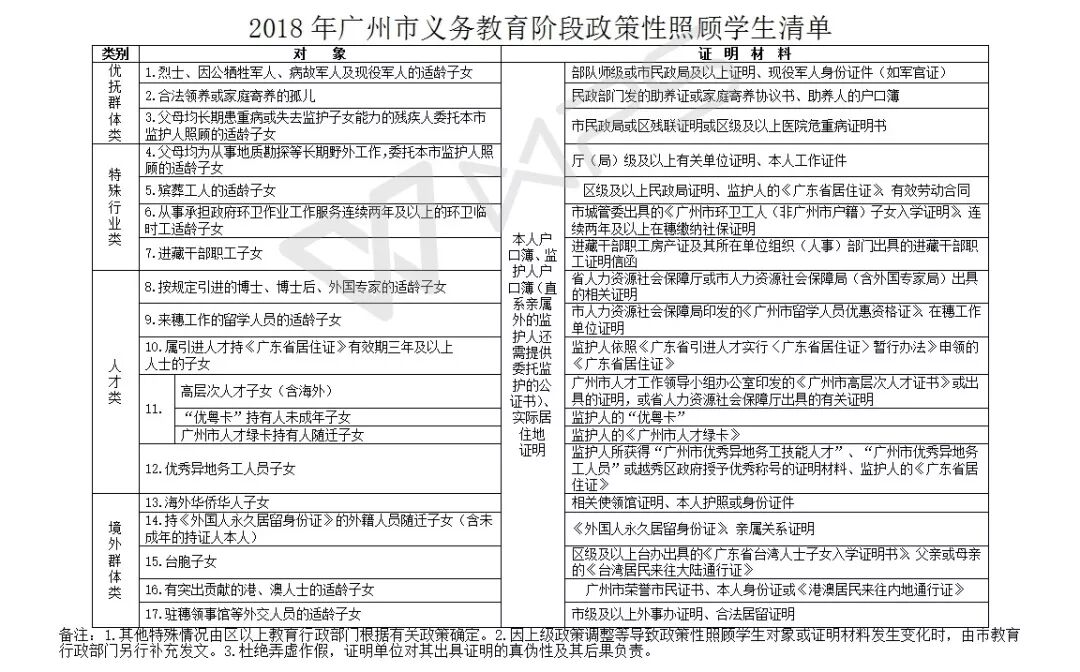 2018年广州市义务教育阶段政策性照顾学生清单