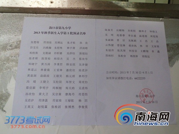 海口龙华区九小第一批新生名单已公示。(南海网记者谭邦会 实习生李雨婷摄 )