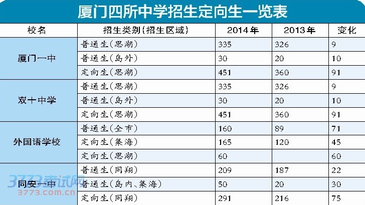 由于取消择校生,今年其他名校的普通生招生人数普遍看涨,其中,厦门一中、双十、外国语三所名校普通生(含定向生)招生计划比去年多了396名。