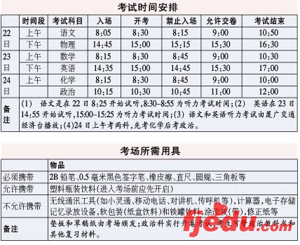 考试时间安排和考场所需用具如下表,特别需要提醒考生的是:语文和英语禁止入场的时间是在开考前15分钟;政治科实行开卷考试,考生可带政治教科书和其他复习材料。