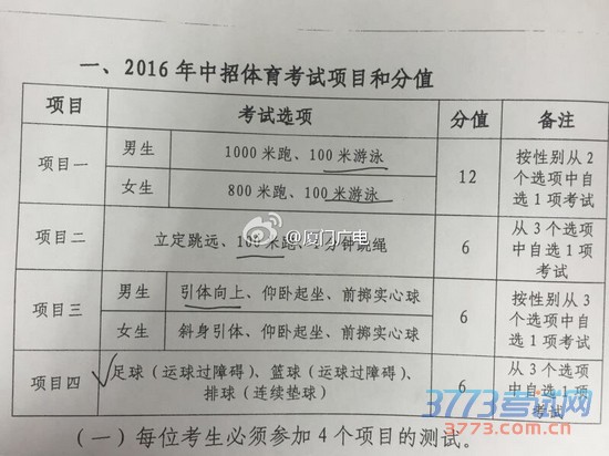 厦门网讯 据厦门广电消息,今天上午,市教育局发布了2016年厦门市中招体育考试方案,2016年厦门市体育中考将由原来的25分增加到30分,其中新增100米游泳、100米跑、足球、篮球、排球等选考项目。考试分为四个项目,考生必须从选项中按性别自选。明后年,厦门还将继续对体育中考进行调整,初步计划2017年分值增加到35分。