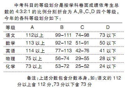 市招办说,中考科目的等级划分是按学科卷面成绩依考生总数的4:3:2:1的比例分别折合为A、B、C、D四个等级,今年的各科等级划分如表所示。值得一提的是,历史等其他4科的等级划分稍早已公布。