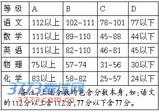 中考五科等级同时公布(见表格)。市招办说,这是根据学科卷面成绩,按考生总数的4∶3∶2∶1的比例分别折合为A、B、C、D四个等级。也就是说,全市40%的考生都达到A,70%达到B级(含A级)以上,90%达到C级(含A和B级)。2013年厦门中考五学科各科等级划分标准如下: