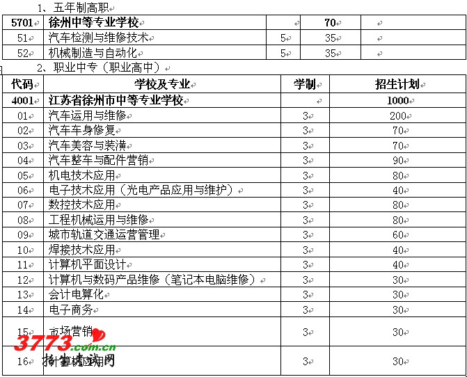 江苏省徐州市中等专业学校是徐州市教育局直属公办国家级重点职业学校和江苏省首批高水平示范性四星级职业学校。学校占地203亩,建筑面积6万平方米,实训基地设备总值达2000余万元。校内建有汽车、机电和信息技术三大实训中心,其中汽车实训中心是中央财政重点支持的与徐州润东汽车集团共建的全省最大的生产性实训中心。目前,学校的汽车、数控及计算机三大专业分别被评为省级品牌或示范专业。2012年该校招生计划如下: