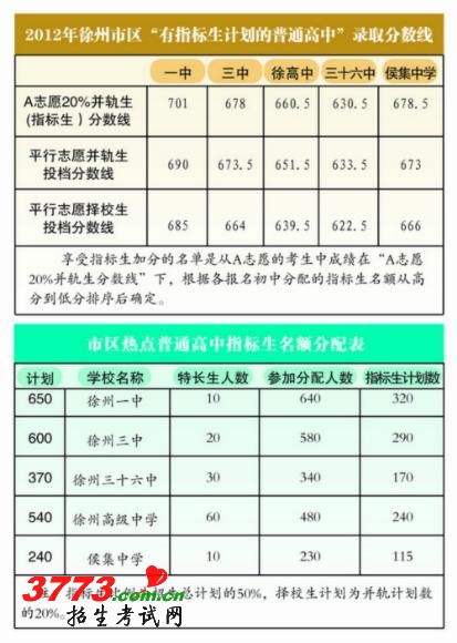 据了解,今年徐州一中a志愿20%并轨生(指标生)分数线为701分,平行志愿并轨生投档分数线为690分,平行志愿择校生投档分数线为685分;徐州三中a志愿20%并轨生(指标生)分数线为678分,平行志愿并轨生投档分数线为673.5分,平行志愿择校生投档分数线为664分;徐州高级中学a志愿20%并轨生(指标生)分数线为660.5分,平行志愿并轨生投档分数线为651.5分,平行志愿择校生投档分数线为639.5分;徐州三十六中a志愿20%并轨生(指标生)分数线为630.5分,平行志愿并轨生投档分数线为633.5分,平行志愿择校生投档分数线为622.5分;侯集中学a志愿20%并轨生(指标生)分数线为678.5分,平行志愿并轨生投档分数线为673分,平行志愿择校生投档分数线为666分。享受指标生加分的名单是从a志愿的考生中成绩在“a志愿20%并轨生分数线”下,根据各报名初中分配的指标生名额从高分到低分排序后确定。