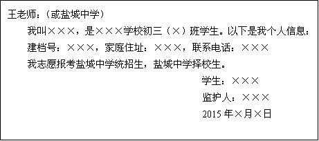在市区就读的在籍考生(含市直、亭湖区、开发区、城南新区)报考盐城中学和盐城市高级实验中学,必须在网上填报盐城中学统招生、盐城中学择校生、盐城市高级实验中学、中美班志愿,录取以考生确认后的电子档案志愿信息为准。
