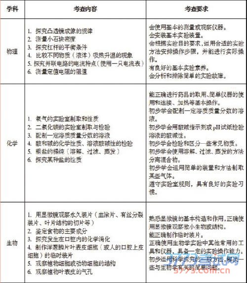 考查采取现场操作、当场打分的方式。考生在进入考场前由考点组织抽签,初二考生从公布的6个生物实验、5个信息技术实践任务中通过抽签选定1个生物实验和1个信息技术实践任务,初三考生从公布的6个物理、6个化学实验中通过抽签各选定1个物理和1个化学实验,并按要求在规定时间内独立完成操作。
