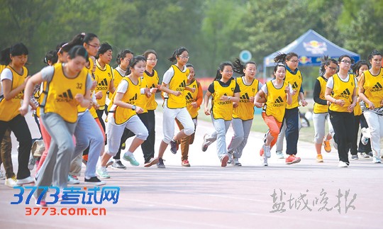 4日下午3时,江苏省盐城中学北校区操场,初中毕业升学体育考试女生800米跑项目的考试正在进行。由于中考体育考试分值会占到中考总分的5%,与文化分合并作为高中录取的总分值,参加考试的学生和家长都非常重视。考试引来了考场外许多家长关注的目光。