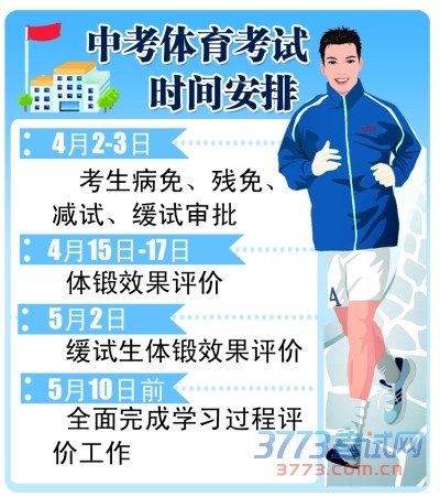 中国江苏网3月14日讯 我市中考体育考试安排昨发布,4月2日-3日,考生进行病免、残免、减试、缓试审批;4月15日-17日进行体锻效果评价,缓试生的体锻效果评价工作于5月2日进行。5月10日前全面完成学习过程评价工作。