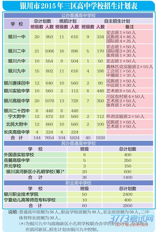 6月16日,记者从银川市教育局了解到,2015年银川市三区高中计划招生11854人,其中公办普通高中招生7654人,民办普通高中1400人,职业高中学校招生2800人。公办普通高中60%的名额将分配到各初中学校。三区以外户籍的考生在银川参加报名考试,特殊原因不能回原籍上学,达到银川高中录取分数线的考生,不再填报录取志愿,实行调剂分配;农民进城务工人员子女可按照有关规定享受同城待遇。此外,今年银川将有23323名学子参加中考,中考时间为6月28日~30日,共设20个考点、785个考场。