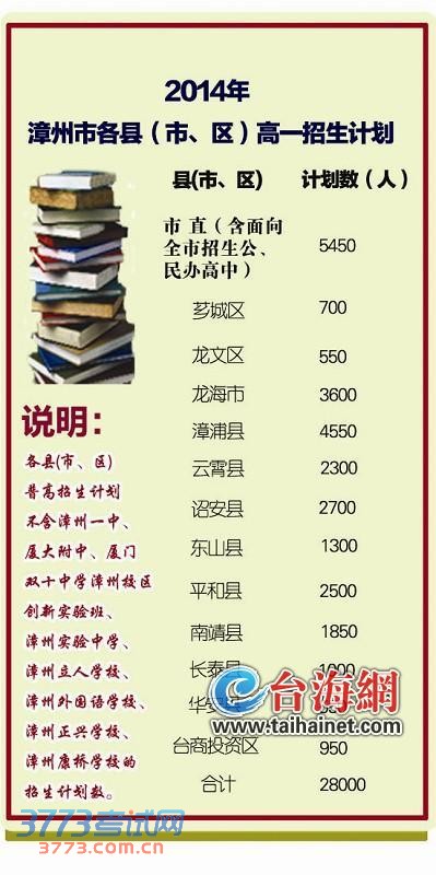 台海网5月6日讯(海峡导报记者 张韩丰)昨日,导报记者从漳州市教育局获悉,《2014年漳州市普通高中招生录取工作的意见》已出炉。漳州一中正取生将招收723人。与往年相比,这次招生工作的最大变化,就是漳州公办达标高中招收择校生比例,从去年20%下调至10%。
