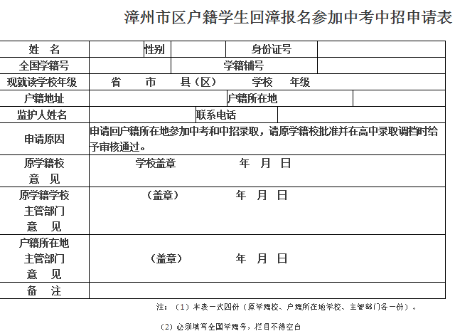 7、在外地市就读的考生,须填写《漳州市区户籍学生回漳报名参加中考中招申请表》,经原就读学校主管局同意盖章后方可报名。(表格附后)。
