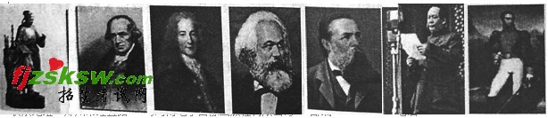 (2)先进思想推动人类文明进步。左起第三幅图片的人物被誉为“启蒙泰斗”“思想之王”,请问这位思想家是谁?(2分)1848年,马克思和恩格斯联合发表了一部重要的著作,请问该著作的发表有什么重大意义?(2分)