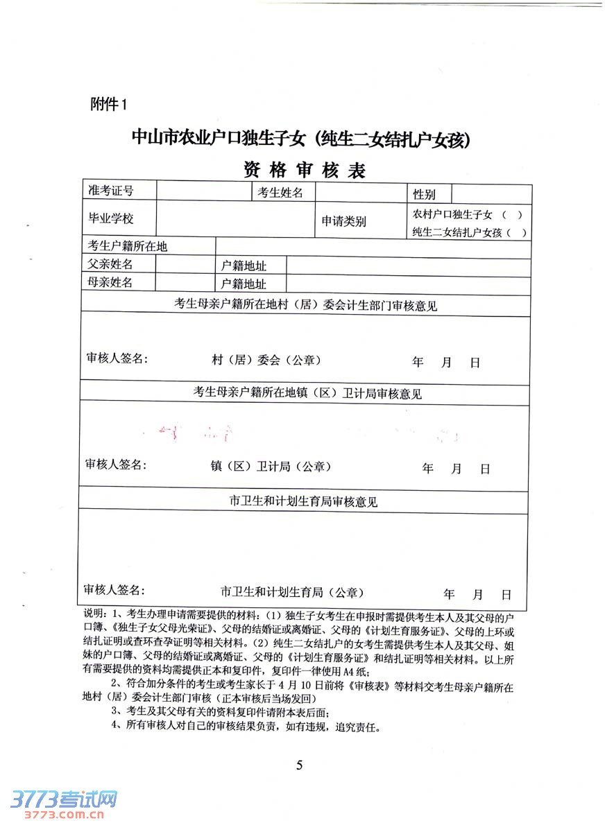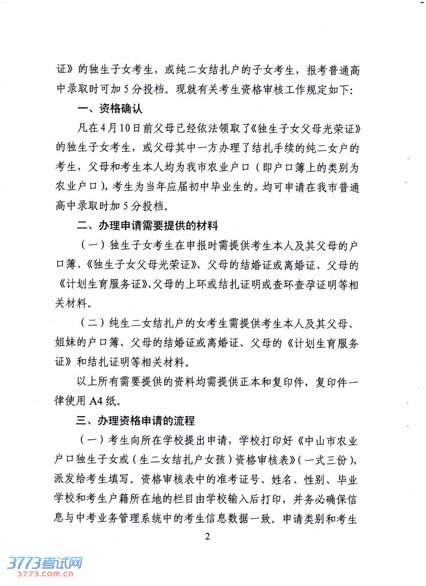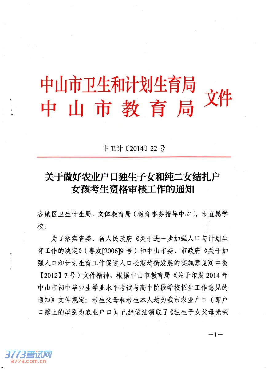 [组图]2014中山中考农业户口独生子女和纯二女结扎户女孩资格审核